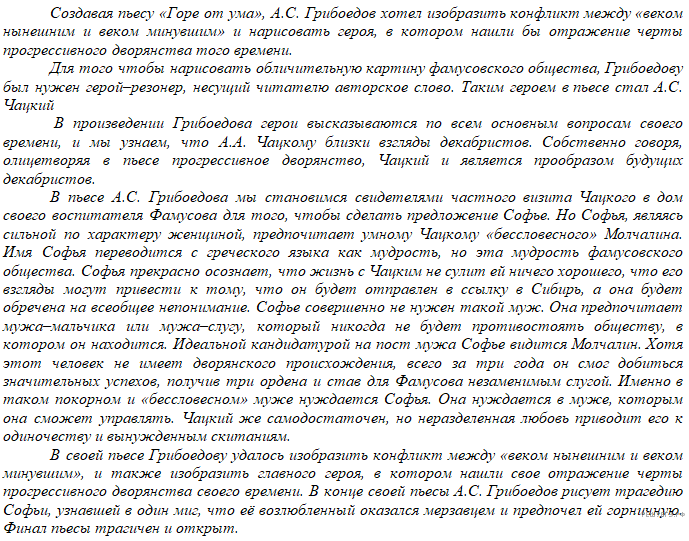 Комедия «Горе от ума» А. С. Грибоедова является одним из самых ярких произведений в творчестве автора. В основе пьесы лежит любовный конфликт, связанный с сюжетной линией Софья — Молчалин — Чацкий. Чацкий возвращается к своей возлюбленной Софье, которую не видел