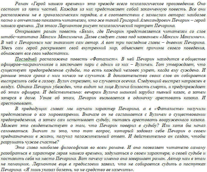 В предыдущих главах мы изучали характер Печорина, а в «Фаталисте» получили представление о его мировоззрении. Вначале он не соглашается с Вуличем о существовании предопределения, а затем сам испытывает судьбу, пытаясь арестовать вооруженного казака.